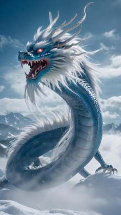 <lora:xl-shanbailing-1025-eastern dragon-000008:0.9>,bailing_eastern dragon,dragon suspended in the air there are clouds,snow,outdoors,red eyes,long hair,snowing,from behind,blue_dragon,