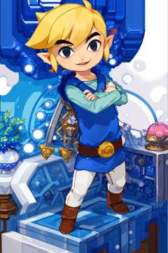 <lora:Harada_Takehito_Background_Dim32:0.8>,((masterpiece,best quality)),  <lora:Toon_Link_Zelda:0.9>, Toon_Link_Zelda, black eyes, blue link, solo, 1boy, tunic, belt,  solo, smiling, standing, looking at viewer,