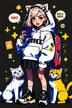 graffiti, 1girl, anger vein, animal, animal ears, animal hood, arrow \(symbol\), backpack, bag, bag charm, bangs, bird, black background, black cat, black hair, black legwear, black skirt, blue hoodie, brown hoodie, card, cat, cat ears, cat hood, cellphone, charm \(object\), chomusuke, crescent, cross, dog, drawstring, fake animal ears, fang, fox, grey hoodie, hair ornament, hairclip, hamster, handheld game console, holding, holding cat, holding phone, holding strap, hood, hood down, hood up, hooded jacket, hoodie, iphone, latin cross, long sleeves, looking at viewer, open mouth, pentagram, phone, pig, pink bag, pleated skirt, puffy long sleeves, puffy sleeves, red eyes, red hoodie, saint quartz \(fate\), school bag, shoes, shoulder bag, shuriken, skirt, sleeves past wrists, smartphone, smile, sneakers, socks, sparkle, spoken anger vein, spoken exclamation mark, standing, star \(symbol\), star earrings, star hair ornament, star pasties, star print, starfish, starry background, stuffed cat, taking picture, tarot, whiskers, white cat, white footwear, white hoodie, x hair ornament, yellow hoodie<lora:graffiti-bg-style-v1.0:1>