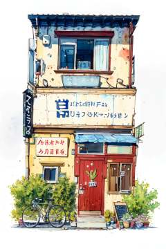 -Architectural marker painting, bicycle, no humans, plant, ground vehicle, scenery, door, window, traditional media, potted plant, watercolor \(medium\), white background, painting \(medium\), sign, outdoors<lora:Architectural marker painting-000018:1>