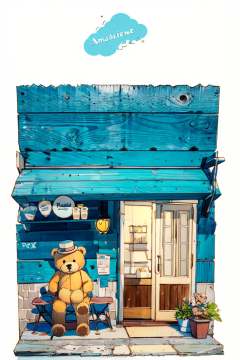 -Architectural marker painting, no humans, teddy bear, stuffed animal, stuffed toy, hat, potted plant, plant, door, cup, sitting, bear, table, bottle, scenery, english text<lora:Architectural marker painting-000018:1>
