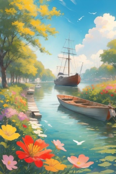 masterpiece,best quality,bird,boat,scenery,tree,flower,watercraft,water,solo,sky,outdoors,