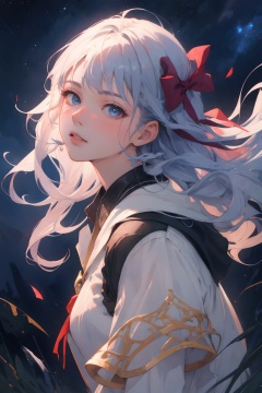 masterpiece,best quality,official art, extremely detailed CG unity 8k wallpaper,absurdres,8k resolution,exquisite facial features,prefect face,shiny skin1girl,solo,beaute,night sky,full body,cowboy shot,bule eyes,rainbow hair,hair ribbon