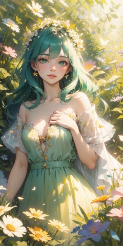 (masterpiece:1.2),best quality,highres,ultra-detailed,HDR,UHD,studio lighting,ultra-fine painting,sharp focus,physically-based rendering,extreme detail description,A springtime fairy,blooming meadow, enchanting, delicate, ethereal beauty, graceful,flowing golden hair, emerald green eyes, afloral wreath crown, petals gown, translucent and shimmering,butterflies and fireflies, a gentle breeze, dappled sunlight, creating a warm ambiance,a sense of rebirth, magic of spring, a fairy princess,pastel colors and soft greens theme, dappled sunlight, soft focus, magical ambiance,bdi,(flat color:0.5),chest