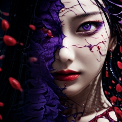 huapi, huapi girl, monster girl, huapighost, 1girl, solo, black hair, purple eyes, petals, eyelashes, portrait, long hair, flower, looking at viewer, lips, red lips, eye focus, red flower, jewelry, blurry, lipstick, rose, earrings, nose, parted lips<lora:LCM_LoRA_Weights_SD15:1>,<lora:NewHuapi:1>,
