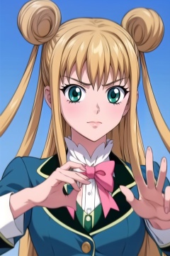 yuanshen,1girl,solo,blonde hair,hair bun,long hair,double bun,bow,day,green eyes,sky,pink bow,parody,school uniform,<lora:add_detail:0.5>,<lora:epiNoiseoffset_v2:0.5>,<lora:EnvyBetterHands LoCon_beta2:1>,perfect hands,<lora:蓝若冰1:0.8>,