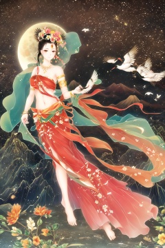 <lora:gilding_v1-000006:0.8>,armlet,barefoot,bird,black hair,flower,hair ornament,midriff,moon,mountain,red-crowned crane,scenery,simple background,solo,