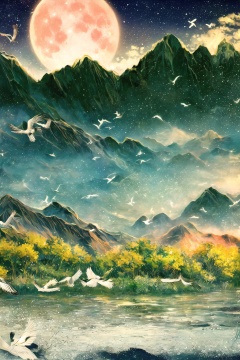 <lora:gilding_v1-000006:0.7>,gilding\\(style\\),bird,moon,mountain,red-crowned crane,scenery,