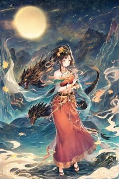<lora:gilding_v1-000006:0.8>,1girl,black dragon,black hair,bracelet,cloud,full body,gilding\\(style\\),long skirt,lotus,mountain,shawl,solo,waves,yellow eyes,