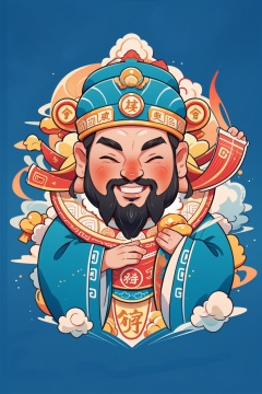 masterpiece,best quality,caishen,1man,facial hair,beard,solo,chinese clothes,long sleeves,wearing black caishen_headwear,wide sleeves,smile,gold,cloud