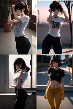 tshirt,yoga pants,cowboy shot,- High-quality photography- Master's work- Detailed face description- Cute girl- Sexy pose- Fashionable woman- Confident expression- Photography- Center of focus is fashion.,in the dark,deep shadow,  <lora:SIFANG-000004:1>