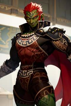 ((masterpiece,best quality)), absurdres, <lora:OoT_Ganondorf_Zelda:0.8>, OoT_Ganondorf_Zelda, solo, ((green skin)), cape, smiling, looking at viewer, cowboy shot, cinematic composition, dynamic pose