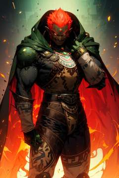 ((masterpiece,best quality)), absurdres,<lora:OoT_Ganondorf_Zelda_Anime:0.8>, OoT_Ganondorf_Zelda, solo, (green skin), cape,solo, smiling, looking at viewer, cowboy shot,<lora:r1ge - AnimeRage:0.8>, r1ge, glowing, red aura,