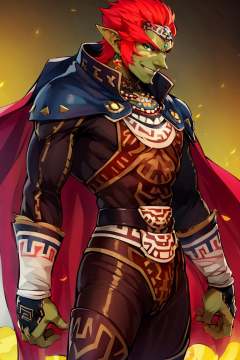 <lora:ricegnat_style:0.8>,((masterpiece,best quality)), absurdres, <lora:OoT_Ganondorf_Zelda_Anime:0.8>, OoT_Ganondorf_Zelda, solo, (green skin), cape, solo, smiling, looking at viewer, cowboy shot,