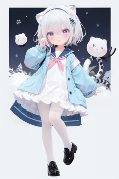 cute,Infant,solo blue shirt,blue sailor coat,loli,full body,white hair,snow leopard ear,white background,pink eyes,laugh,happy,white pantihose,white pantyhose,red armband,