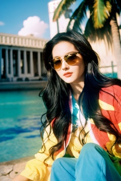 ldr,realistic,masterpiece,best quality,ultra realistic,8k,extremely detailed, best quality,1girlLong hair,sunglasses, outdoors,Lovely,light Highly saturated,light bright,light bright colors, vibrancy, vitality,(film overlay:0.3), (faded overlay:0.5), monkren