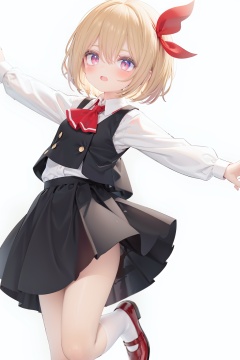1girl, rumia, blonde hair, solo, white background, red eyes, red footwear, simple background, ascot, short hair, ribbon, open mouth, hair ribbon, smile, long sleeves, shirt, looking at viewer, red ascot, white socks, white shirt, red ribbon, shoes, socks, frills, bangs, outstretched arms, hair between eyes, skirt, :d, dress, vest, mary janes, black dress, black skirt, collared shirt, black vest, blush