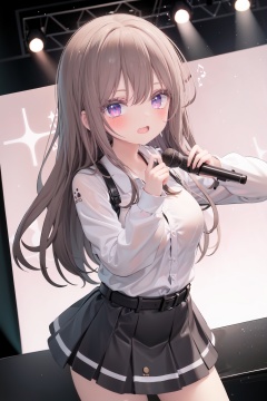 1girl, solo, microphone, smile, skirt, blush, brown eyes, long hair, open mouth, looking at viewer, brown hair, long sleeves, :d, shirt, bangs, belt, breasts, pink shirt, outstretched arm, music, black belt, medium breasts, holding microphone, singing