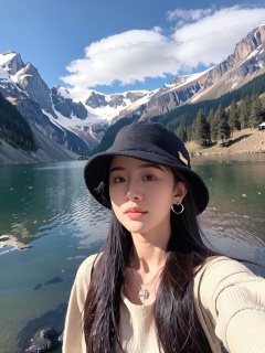 1girl, solo, hat, jewelry, long hair, realistic, black hair, earrings, outdoors, photo background, mountain, necklace, river, looking at viewer, lake, day, nature, upper body, black eyes, lips, a woman with long hair wearing a hat and a backpack near a lake and mountains with snow on the tops