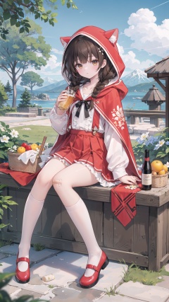 1girl, bottle, solo, skirt, sitting, braid, outdoors, hood, shirt, socks, white socks, white shirt, red skirt, twin braids, shoes, bandaid, red footwear, wine bottle, looking at viewer, tree, brown hair, day, long hair, holding, frills, little red riding hood (grimm), frilled skirt, food, bandaid on leg, mary janes, closed mouth, yellow eyes, hood up, bow, basket, kneehighs, fruit, sky, cloak, hooded cloak, grass, bangs, hooded cape, hooded capelet, alcohol, animal hood, full body, picnic basket, cup, cloud, bandaid on knee, pleated skirt, mountain, cape, brown eyes, collarbone, backlight