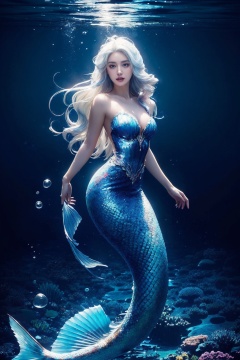 A mermaid,upper body tight fitting clothing,underwater,leaning against the sea,white hair,realistic style with fantasy elements,real characters have fish tails,high-definition,realistic Baby blue and light black,charming realistic characters,shiny skin,Surrealism,detailed clothing,The Tyndall effect,The Holy sky light enhances your features and highlights your eyes. You are the star of the show,(chiaroscuro,Fujicolor, UHD, super detail ,raw,85mm,f/1.2,FujifilmXT4,),<lora:mermaid_20231203140950-000008:0.6>,