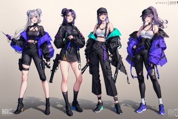 -cacao, weapon, gun, long hair, rifle, shoes, multiple girls, sneakers, socks, hat, 5girls, purple eyes, holding, holding weapon, black hair, assault rifle, pants, knee pads, blonde hair, breasts, jacket, holding gun, belt, hair bun, looking at viewer, skirt, choker, standing, short hair, ponytail, sword, gloves, grey hair, thighhighs, baseball cap, black footwear, double bun, submachine gun, fishnets, scope, off shoulder, bare shoulders, high heels, grey background, earrings, boots, jewelry, long sleeves, purple footwear, medium breasts, coat, fingernails, sheath, gradient, hand on hip, thigh strap, bangs, hood down, artist name, thigh pouch, sheathed, trigger discipline, gradient background, parted lips, midriff, hood, nail polish, black gloves, crop top, open mouth, blue eyes, open clothes, shirt, black jacket, purple hair, smile, sleeves past wrists, handgun, sniper rifle, black pants, katana, kneehighs, mole, fanny pack, zipper, fingerless gloves, h&k hk416, bag, holster, hair ornament, legs apart, collarbone, signature, brown eyes, black skirt, white shirt, sleeveless, yellow eyes, grey jacket, nike, closed mouth, grey pants, bandaid, cleavage, ar-15<lora:cacao-000018:0.8>,