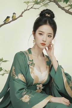 a woman in a green dress sitting on a tree branch with a bird flying over her head and a bird flying over her head,1girl,hanfu,hair ornament,black hair,long sleeves,chinese clothes,shawl,holding,jewelry,solo,long hair,full body,dress,tassel,earrings,tree,forehead mark,wide sleeves,breasts,hair stick,flower,hair bun,green dress,cleavage,bird,closed mouth,norfleet,Best quality,masterpiece,ultra high res, chinese clothes