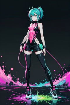 A girl,a female anime character is wearing futuristic and shoes, in the style of psychedelic neon, nintencore, skottie young, light pink and light black, kidcore, dark white and dark cyan, colorful chaos
