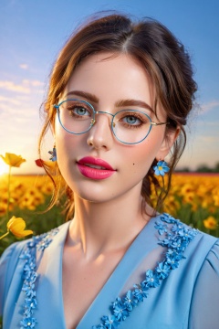 (best quality, highres, masterpiece:1.2), ultra-detailed, (realistic, photorealistic, photo-realistic:1.37), 1girl, intricate eyes, longeyelashes, beautiful detailed eyes, beautiful detailed lips, blue dress, happy, freckles, hair flower, earrings, glasses, flower field, blue sky, sunset, Cinematic light,<lora:EMS-89317-EMS:0.800000>