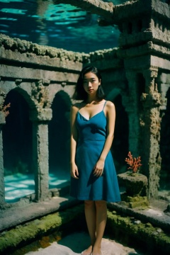 sfw,1girl cleavage,chinese girl,full body,perfect hands,looking at viewer underwater,shadow,dramatic lighting Coral castle lofi,analog,kodak film by Ryan McGinley,
