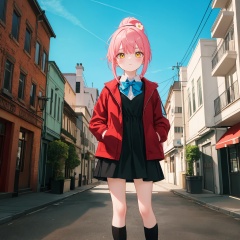 (best quality), ((masterpiece)), (highres),standing,original, extremely detailed wallpaper, (an extremely delicate and beautiful),(loli),(petite),Pink hair,Yellow eyes, (red Jacket),high ponytail,white collared shirt,hair flower,fipped hair,floating hair,Frown,hands in pockets,black dress,red bowtie,(solo),full body,standing,street,city,focused,solo,backlight