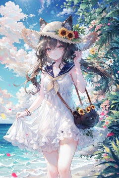 1girl, flower, hat flower, solo, dress, animal ears, hair between eyes, hat, rose, bangs, sleeveless dress, ears through headwear, sleeveless, tail, parted lips, outdoors, blue dress, yellow flower, day, straw hat, pink flower, wolf ears, shoulder bag, blue sky, wolf tail, water, sunflower, white flower, sky, ferris wheel, looking at viewer, sailor collar, red flower, animal, collarbone, hand up, underwear, blush, bare shoulders, animal ear fluff, sailor dress, blue flower, petals, bag, neckerchief, cloud, blue sailor collar, ocean, wolf girl, breasts, bloomers, standing, animal bag, cloudy sky, brown hair, bare arms, brown eyes, sun hat, horizon