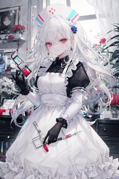 1girl, solo, heterochromia, puffy sleeves, white apron, rose, red eyes, long hair, flower, holding, black gloves, long sleeves, black flower, dress, gloves, apron, bangs, syringe, red flower, hat, black dress, hair between eyes, black rose, frills, frilled apron, very long hair, nurse cap, white headwear, looking at viewer, closed mouth, juliet sleeves, red rose, holding flower, collared dress, white hair, breasts, earrings, puffy short sleeves, nurse, frilled dress, blush, cross, jewelry, medium breasts, puffy long sleeves, short sleeves, holding syringe, indoors