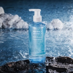 RAW photo, Clear bottle, water, white sand, sea salt, top-down Angle, gradient background, ambient light, (subject lighting), 8k Ultra HD, SLR camera, Sharp contrast light, High quality, Film texture, Fujifilm XT3, Blue scene (style)