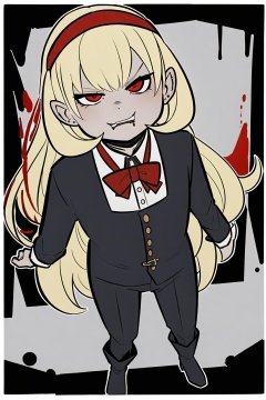1girl,wsdxj,solo,ojousama,narrow one's eyes,cuteg,red headband,red bowtie,full body,age regression,rejection,(evil atmosphere:1.1),bewitching/bizarre/sinister appearance,guihuo inferno,blood head ring,
