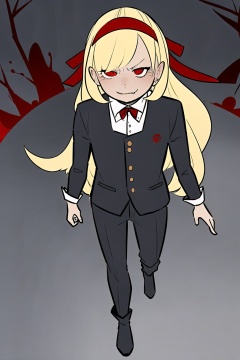 1girl,wsdxj,solo,ojousama,narrow one's eyes,cuteg,red headband,red bowtie,overlook,full body,age regression,rejection,(evil atmosphere:1.1),bewitching/bizarre/sinister appearance,
