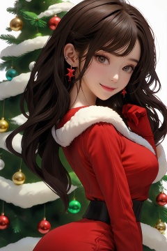 1girl,solo,christmas tree,long hair,jewelry,red gloves,earrings,side slit,looking at viewer,gloves,christmas,dress,red dress,long sleeves,christmas ornaments,star (symbol),smile,belt,breasts,black hair,from side,cowboy shot,brown eyes,closed mouth,ass,lips,fur trim,simple background,bangs,medium breasts,brown hair,santa costume,looking back,white background,wavy hair,black eyes,fur-trimmed sleeves,<lora:shengdan:0.6>,normal fingers,