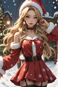 1girl,solo,hat,santa hat,long hair,looking at viewer,blonde hair,santa costume,skirt,choker,christmas,fur trim,jewelry,blurry,earrings,thighhighs,breasts,belt,fur-trimmed headwear,snowflakes,black choker,garter straps,red skirt,long sleeves,snow,red headwear,fur-trimmed sleeves,grey eyes,<lora:shengdan:0.4>,
