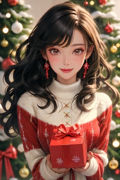 1girl,solo,jewelry,gift,earrings,long hair,holding,black hair,smile,bow,looking at viewer,dress,box,blurry background,red bow,hair bow,gift box,blush,blurry,sweater,christmas,long sleeves,holding gift,brown eyes,ribbon,white dress,white sweater,nail polish,parted lips,bangs,ring,christmas tree,red nails,holding box,fingernails,hair ribbon,turtleneck,christmas ornaments,red lips,red ribbon,depth of field,floral print,turtleneck sweater,wavy hair,cowboy shot,lips,<lora:shengdan:0.6>,normal fingers,