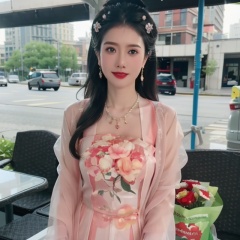 upper bare,masterpiece, Original, Stand, a beautiful woman with a bouquet of flowers in her hand, long hair, wearing a suit on the upper body, light gray thick tights on the lower body, Bag, jewelry, Necklace, Earrings, Ring, rounded at the knees, waiting for someone, with a sweet smile, newspaper, The best quality, Ray tracing, 8k, 1girl