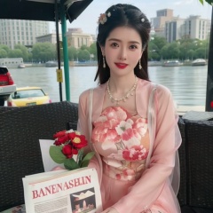 upper bare,masterpiece, Original, Stand, a beautiful woman with a bouquet of flowers in her hand, long hair, wearing a suit on the upper body, light gray thick tights on the lower body, Bag, jewelry, Necklace, Earrings, Ring, rounded at the knees, waiting for someone, with a sweet smile, newspaper, The best quality, Ray tracing, 8k, 1girl
