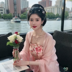 upper bare,masterpiece, Original, Stand, a beautiful woman with a bouquet of flowers in her hand, long hair, wearing a suit on the upper body, light gray thick tights on the lower body, Bag, jewelry, Necklace, Earrings, Ring, rounded at the knees, waiting for someone, with a sweet smile, newspaper, The best quality, Ray tracing, 8k, 1girl
