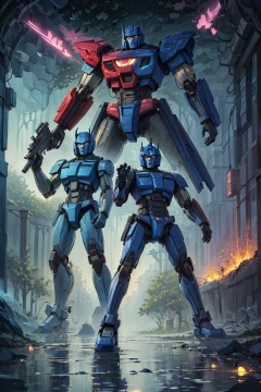 autobot, decepticon, glowing, glowing eyes, gun, holding gun, holding sword, holding weapon, insignia, letterboxed, mecha, no humans, oekaki, open hand, optimus prime, retro artstyle, science fiction, size difference, v-fin, weapon