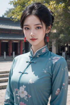 (best quality, masterpiece, 8K, ultra high res, realistic:1.3),(Beautiful and detailed face:1.2),(upper body:1.2),1girl,solo,looking at viewer,big eyes,small breasts,slim body,arms at sides,smile,(Extremely detailed chinese clothes:1.2),earrings,hairpin,necklace,architecture,east asian,riverside,forest,