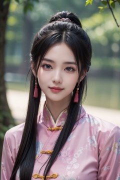 (best quality, masterpiece, 8K, ultra high res, realistic:1.3),(Beautiful and detailed face:1.2),(upper body:1.2),1girl,solo,looking at viewer,big eyes,small breasts,slim body,arms at sides,smile,(Extremely detailed pink chinese clothes:1.2),hairpin,architecture,east asian,riverside,forest,