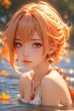 1girl,Short hair, earrings, necklaces, orange hair, off shoulder, chest, water, looking at the audience, the fallen leaves on the water,partially submerged, sunset, afterglow, evening,yoimiya (genshin impact)
