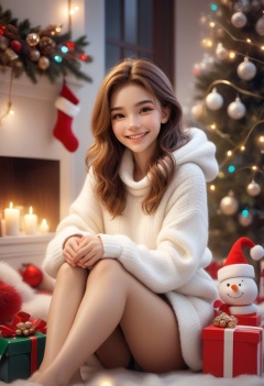 Christmas scene with a cute white 20 years old girl sitting among christmas decorations, smile, fluffy,  lights, holiday atmosphere, ultra-fine, digital painting