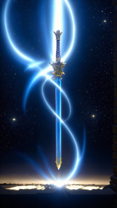(Dao pattern) (Special effects) (Suspended energy lines at night) (Transparent art) (Dark night) A swordsman dances under the stars with a sword in his hand. The sword light was like a bright galaxy, leaving a blue stream of light every time it was swung. The swordsman and the starry sky complement each other, as if he is talking to the stars