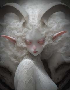 albino demon girl with lethargic sleepy smokey eyes, white curls , insect eyes, antenna , mesh fishnet blouse, (long intricate horns:1.2)  <lora:pale_demon:1>   best quality, highest quality, extremely detailed CG unity 8k wallpaper, detailed and intricate,
