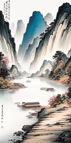 GFSM,  scenery,  water,  watercraft,  boat,  no humans,  outdoors,  tree,  mountain,  river,  waterfall,  lake,  architecture,  nature,  traditional media,  east asian architecture,  chinese text,  seal,<lora:EMS-194010-EMS:1.000000>
